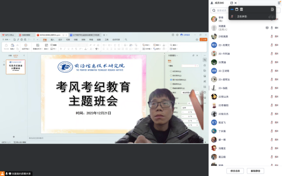 2023年12月21日晚,公司召开“考风考纪教育主题班会”,此次班会采用线上的形式,由刘建美、刘长慧老师主持,全体研究生参加。