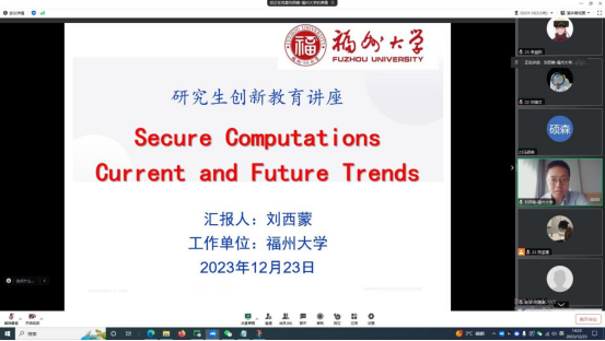 2023年12月23日下午两点半,福州大学刘西蒙教授应前沿信息技术研究院邀请,以线上会议的形式,作了“密态计算理论与应用”的讲座。讲座由公司副经理潘恒主持,全体研究生参加。