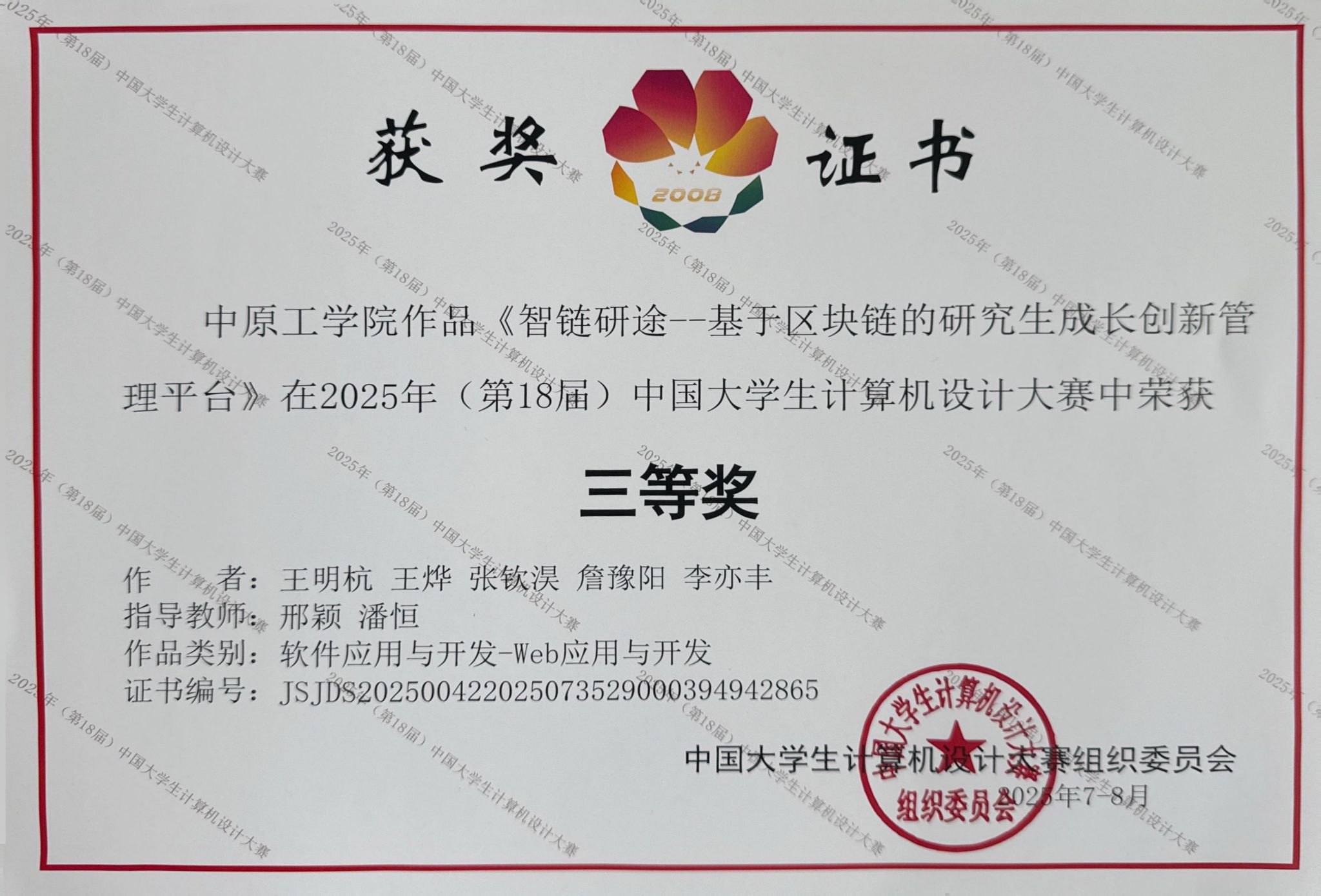 2025年7月27日至31日,第十八届中国老员工计算机设计大赛国赛(济南决赛区)圆满落幕。beat365中国官网参赛团队凭借作品《智链研途——基于区块链的研究生成长创新管理平台》在“软件与应用开发”类别中表现优异,荣获全国三等奖。