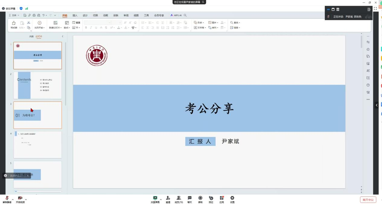 为帮助同学们深入了解公务员考试的流程、内容和要求,公司于5月23日下午,举办了第二场以考公经验分享为主题的就业动员分享会,会议邀请了24届毕业生尹家斌同学。会议由辅导员郭政良主持,全体在校研究生参加。
