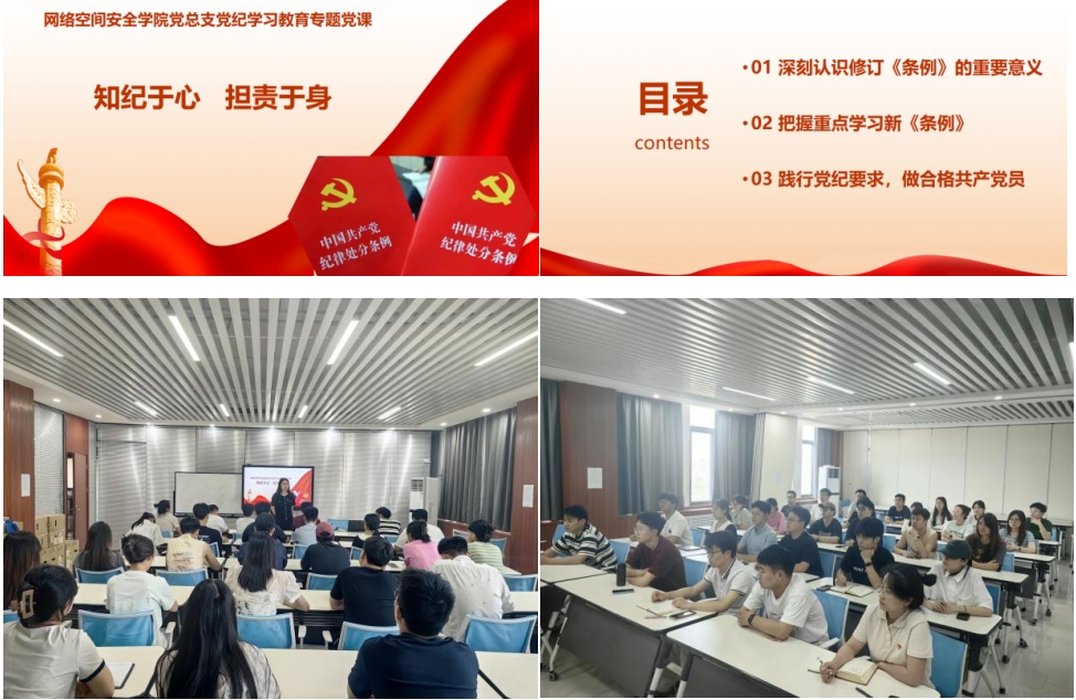 党课以“知纪于心,担责于身”为主题,从深刻认识修订《中国共产党纪律处分条例》的重要意义、到把握重点学习新《条例》、再到践行党纪要求,做合格共产党员三个方面详细阐述了《条例》修订的历史沿革、重要意义,结合学习工作实际解读了《条例》的最新修订内容,最后从增强自我约束能力,严格遵守各项规定,不越红线底线,自我监督与他人监督相结合,不断提升自身素质,争做时代先锋等角度对全体党员如何践行党纪要求做合格共产党员提出了要求。
