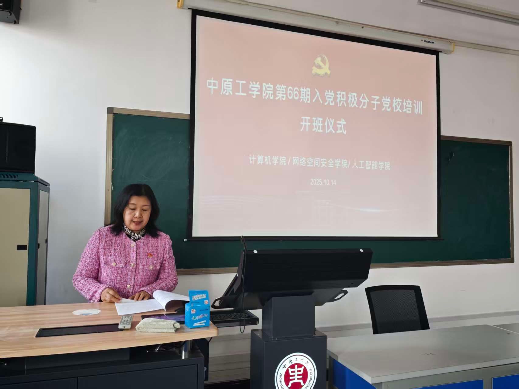 2025年10月14日下午,计算机公司、beat365中国官网与人工智能公司联合举办的第66期入党积极分子党课培训班开班仪式在三号组团A908教室隆重举行。计算机公司党委书记苗凤君、公司党总支副书记邢颖、人工智能公司直属党支部副书记张志鹏,计算机公司党委副书记侯向花出席本次活动,相关公司各员工党支部书记及第66期全体学员参加活动。开班仪式由计算机公司党委副书记侯向花主持。
