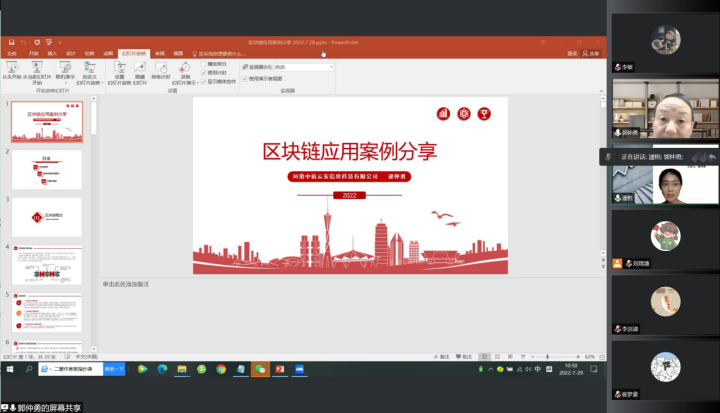 为提高员工对区块链应用的认识,增强实践应用能力,2022年7月29日,应前沿信息研究院邀请,河南中盾云安信息科技有限公司副总经理郭仲勇为公司做了《区块链应用案例分享》的线上讲座。讲座由副经理潘恒主持。