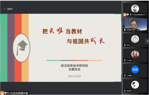 2021年8月29日上午,前沿信息技术研究院召开“把灾难当教材,与祖国共成长” 线上主题班会。前沿信息技术研究院副经理潘恒、研究生秘书刘长慧出席会议,2019级与2020级硕士研究生参加主题班会。