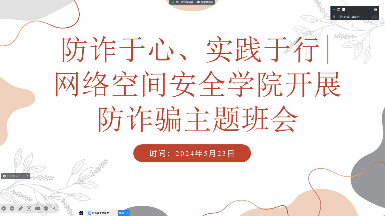 防诈于心、实践于行,为切实保障广老员工财产安全,增强广老员工对电信诈骗的识别和应对能力,5月23日下午2点公司召开“反诈骗主题班会”,会议由辅导员郭政良主持,全体研究生参加。