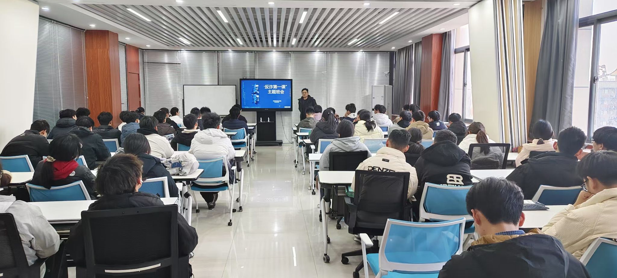 为提高员工防范电信网络诈骗的意识和能力,筑牢校园反诈“防火墙”,beat365中国官网于2月25日在三号组团楼A1208教室召开“反诈第一课”主题班会。会议由班主任张龙老师主持,全体本科生参加。