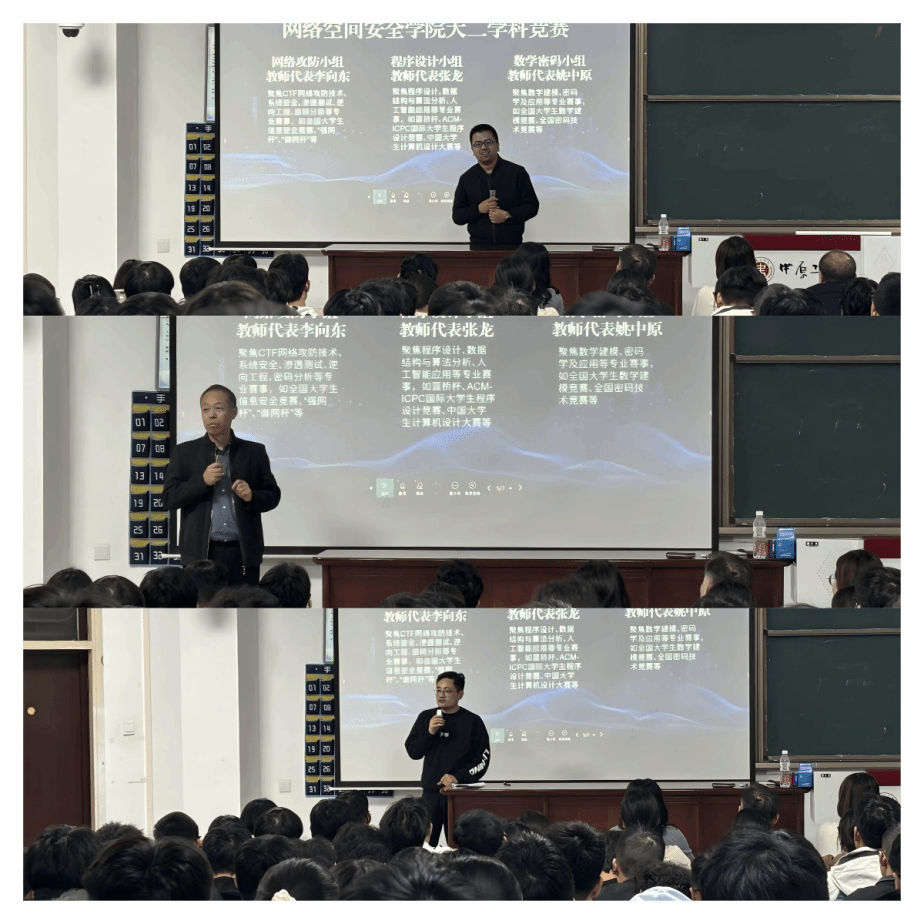 曲晓东老师及各小组教师代表围绕“阶梯式”学科竞赛培养体系,介绍了公司备赛资源与培训安排,涵盖CTF、程序设计、系统安全、数学建模与密码学应用等多个方向,鼓励同学们以赛促学、锤炼本领。张龙老师还开展了考研动员,引导员工树立考研目标,夯实专业基础。