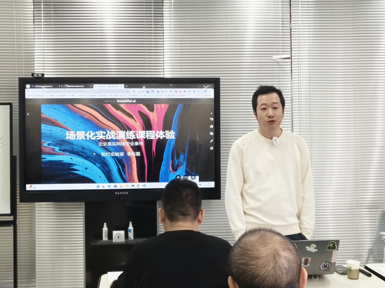实战演练环节,李石磊为员工构建了一个线上虚拟平台,以企业实际发生的网络安全案例为演练素材,邀请员工们进行了一次场景化实战演练体验,使员工得以深入接触并真切感受网络安全案例。实践过程中,员工们相互探讨,提升了对网络空间安全技术的学习热情与探索欲望,进一步激发了员工们在该领域深入钻研的积极性。